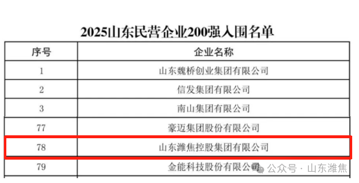 近日,山東省工商聯(lián)、省發(fā)展改革委、省科技廳、省人力資源社會保障廳、省農(nóng)業(yè)農(nóng)村廳、省商務(wù)廳、省稅務(wù)局、省市場監(jiān)管局、省總商會共同組織開展了2025山東民營企業(yè)百強(qiáng)系列榜單發(fā)布活動。山東濰焦控股集團(tuán)有限公司榮登“2025山東民營企業(yè)200強(qiáng)”第78位。