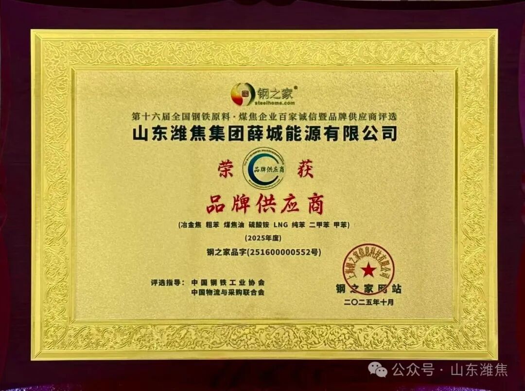近日,“鋼之家第十六屆全國鋼鐵原料煤焦企業(yè)百家誠信暨品牌供應(yīng)商”評選活動順利舉行,經(jīng)鋼之家網(wǎng)站征信取證,中國鋼鐵工業(yè)協(xié)會及中國物流與采購聯(lián)合會專家綜合評審,山東濰焦集團薛城能源有限公司被評為2025年度“品牌供應(yīng)商”殊榮。榮譽證書